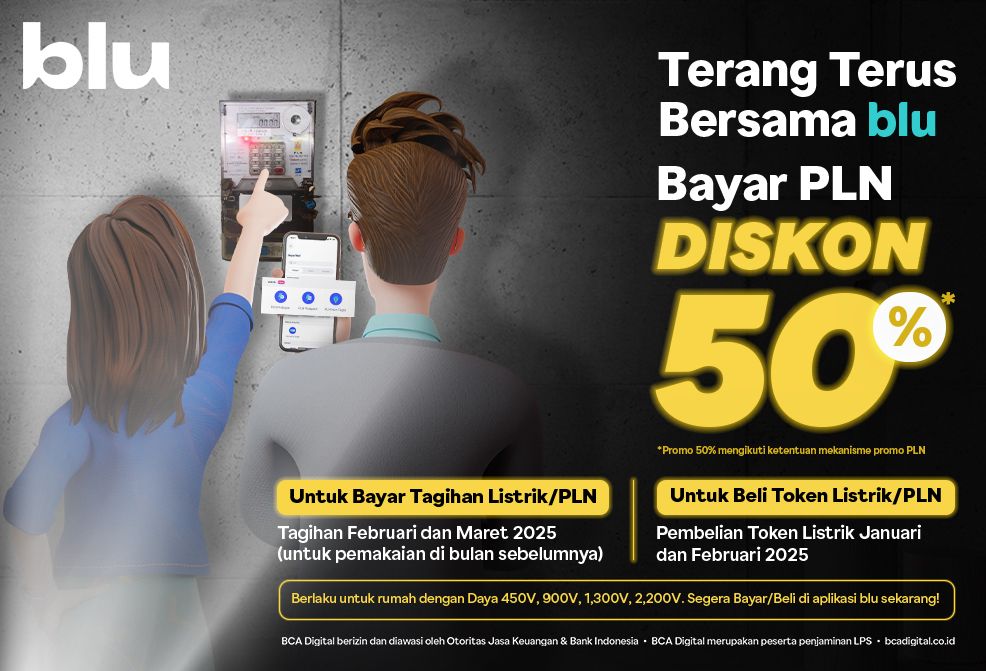 Selama bulan Januari - Maret 2025, sobatblu dapat menikmati diskon 50% untuk pembayaran tagihan atau pembelian token listrik PLN, lho 🤩